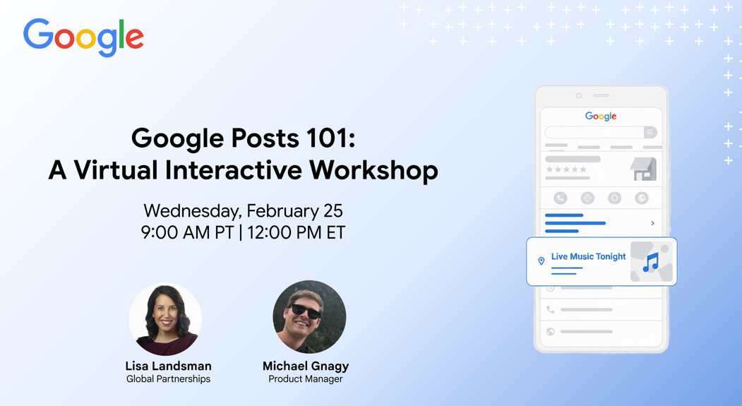 Join us for a 30-minute introductory workshop on February 25th 9am PT/ 12pm ET, where we’ll show you how to use the newly updated Google Posts tool to keep your customers in the loop on timely events, offers and updates.